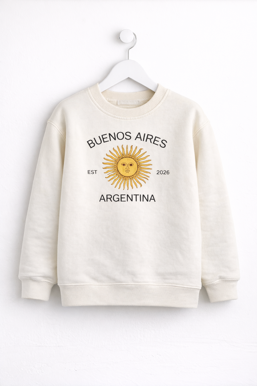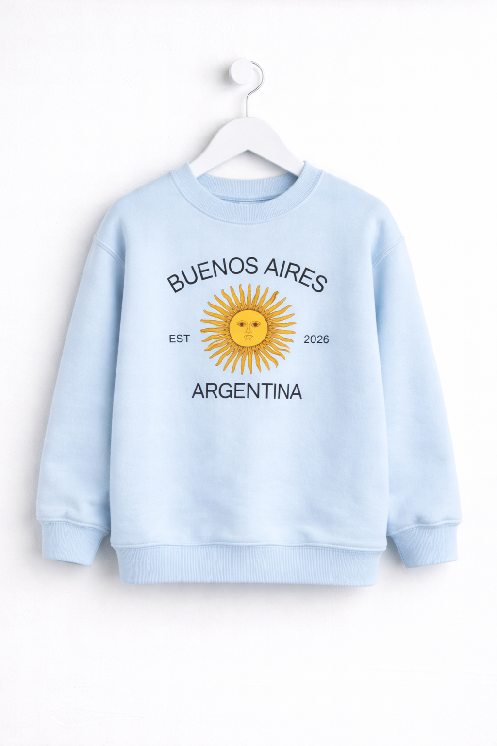 Buzo infantil UNISEX de friza con estampa “BUENOS AIRES” y sol de mayo en el pecho.